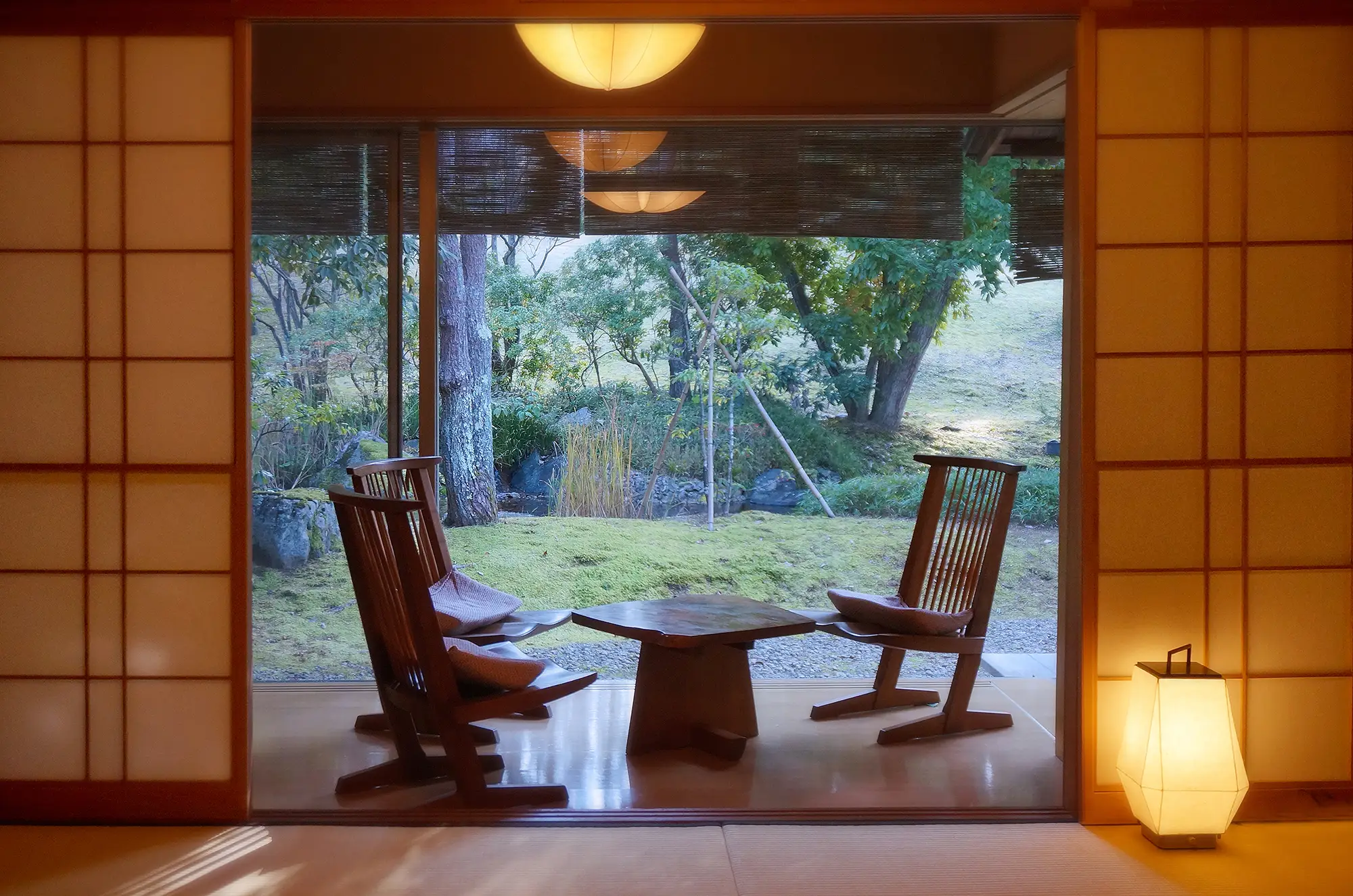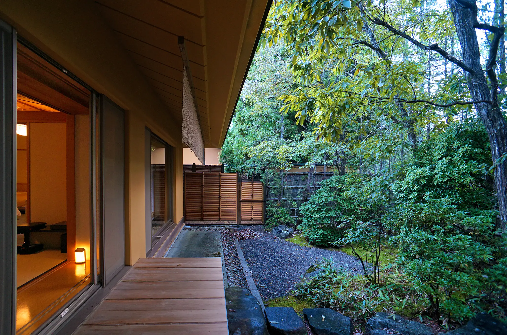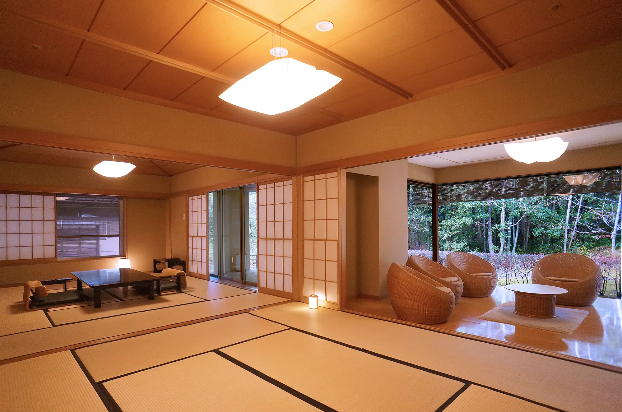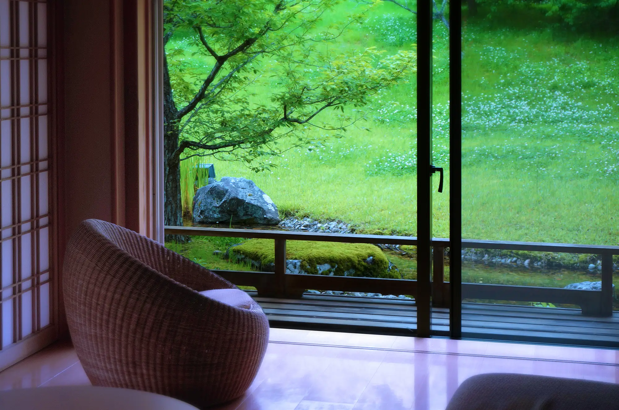 客室早乙女は和洋室(2ベット)の仕様。御風呂は「わかし内湯」のみとなります。プライベートなお庭が魅力のお部屋です。