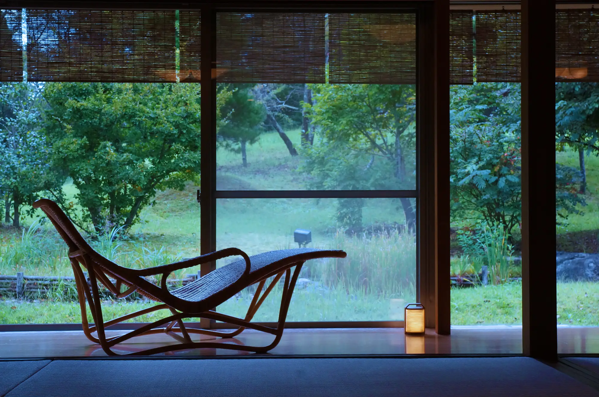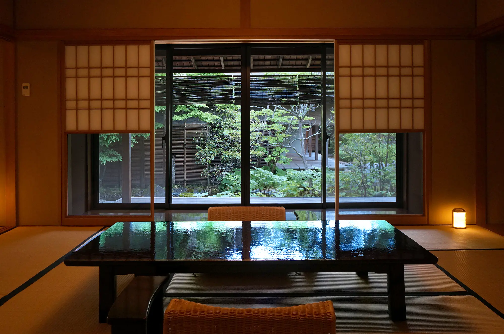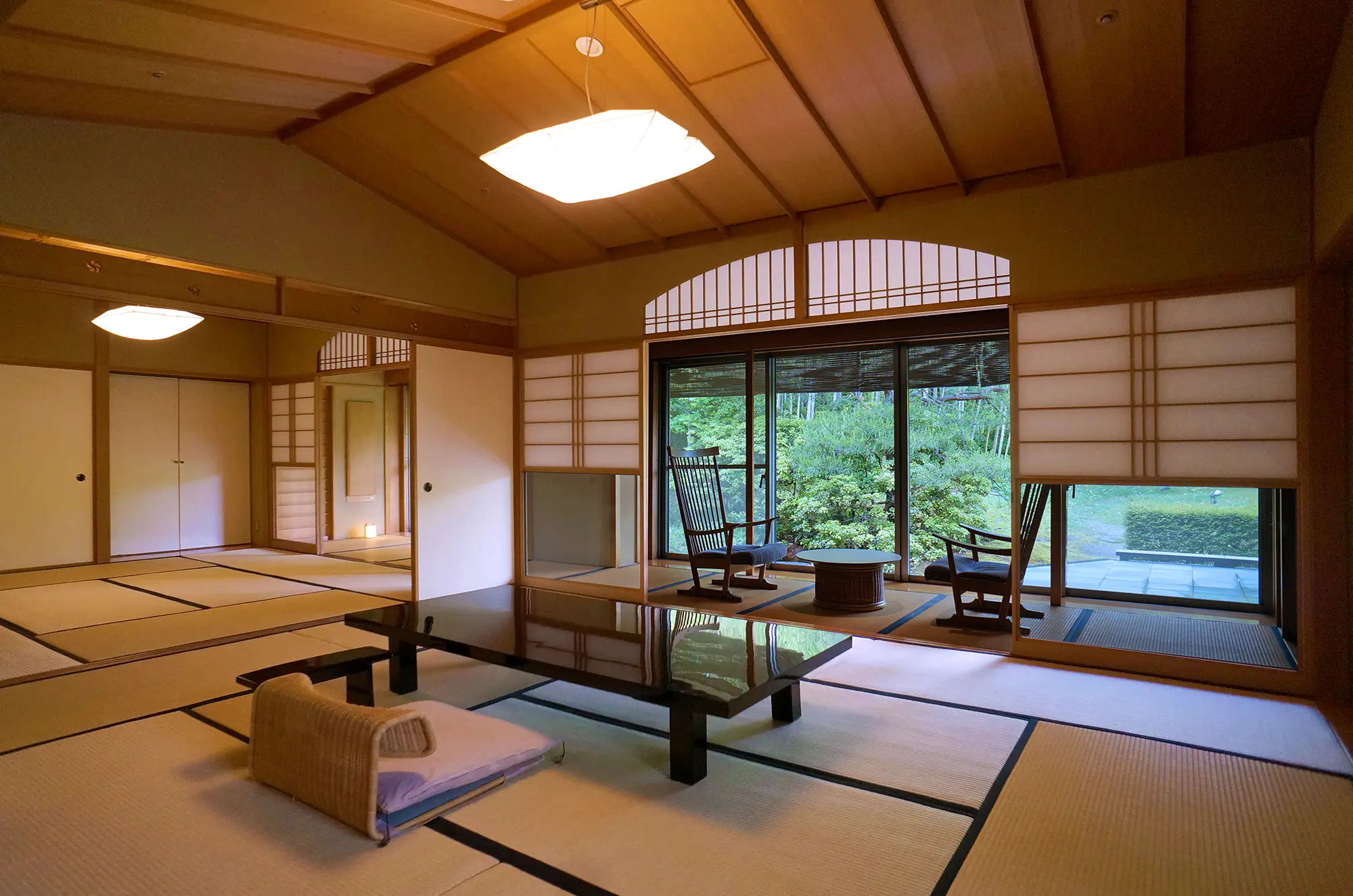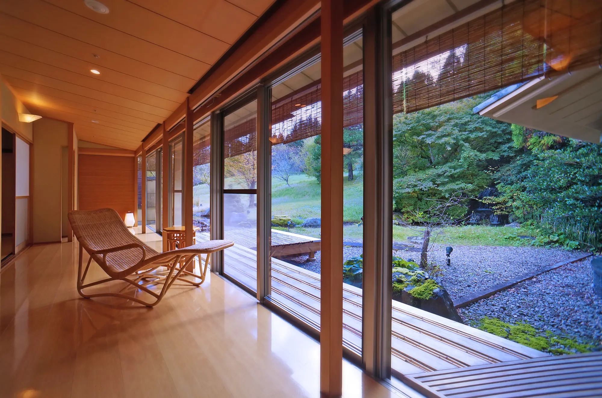 客室早乙女は和洋室(2ベット)の仕様。御風呂は「わかし内湯」のみとなります。プライベートなお庭が魅力のお部屋です。